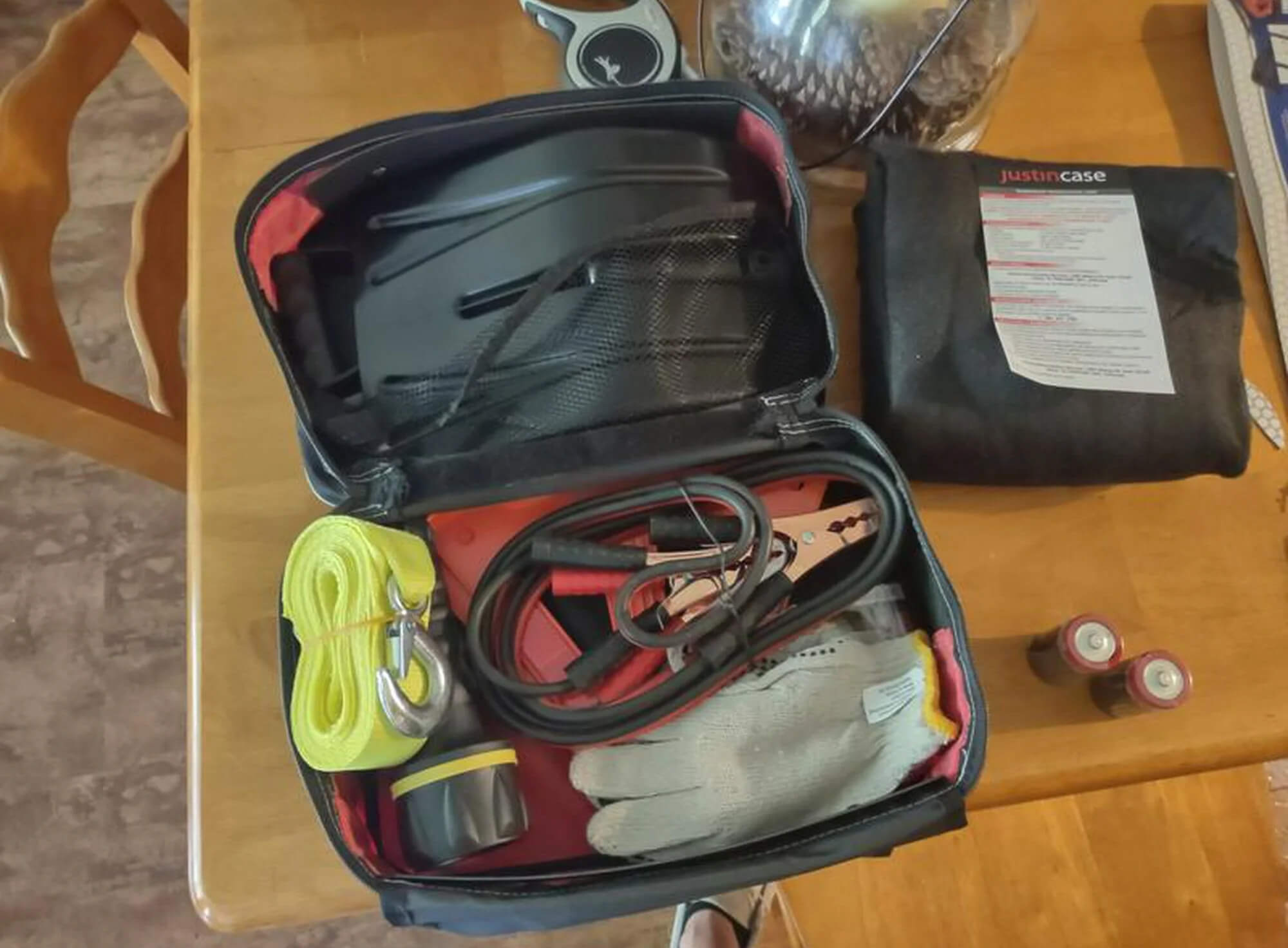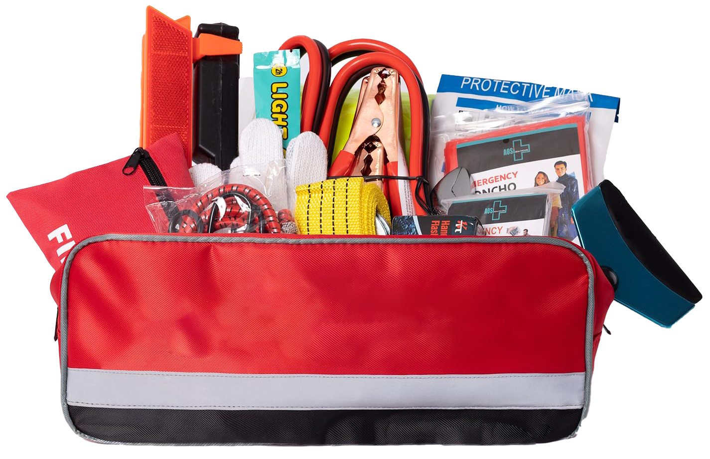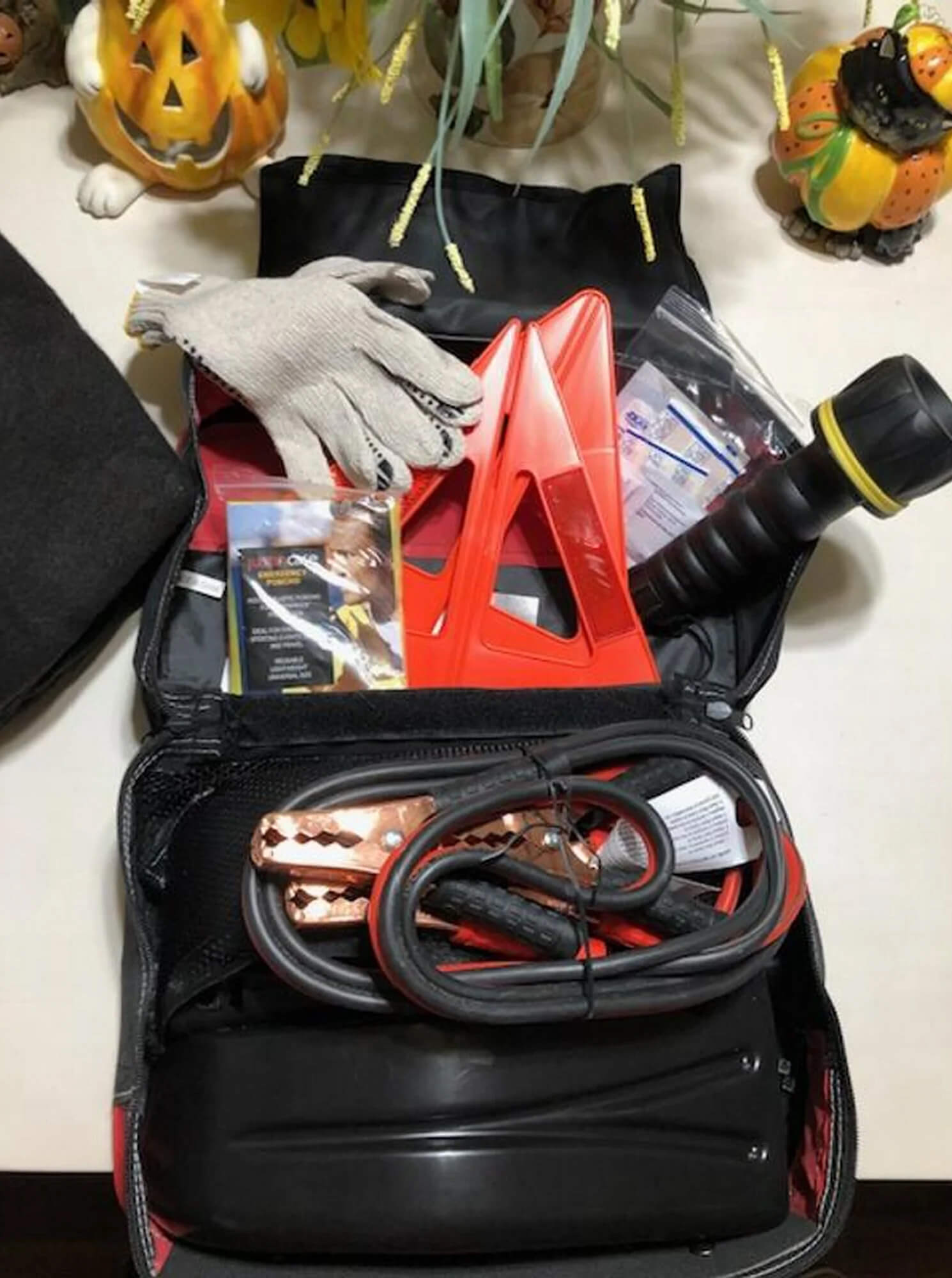 - Comprehensive set: jumper cables, flashlight, first aid items & more